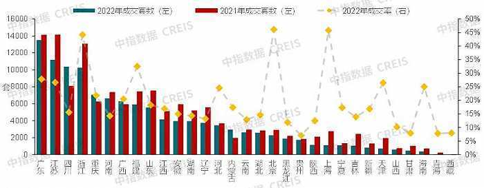 2021、2022年各省法拍房成交套数及成交率。图片来源:中指研究院
