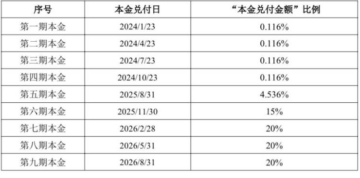 2024年7月23日,兑付第三期本金兑付金额自2023年8月31日(含) 至2024年7月23日(不含)产生的相关利息;