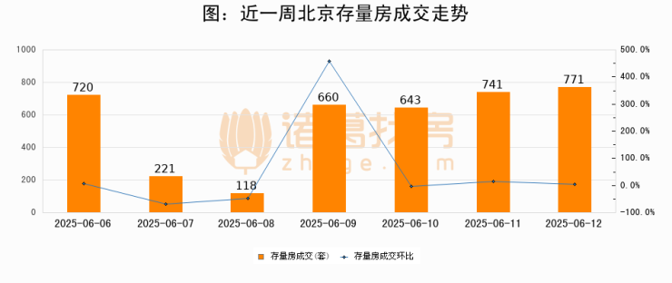 从存量房来看,2025年06月12日北京存量房单日成交771套,比昨日增加30套,环比上涨4%。从近一周存量房成交来看,北京存量房日均成交套数为553套,06月12日单日成交771套,高于近一周平均水平39.4%。