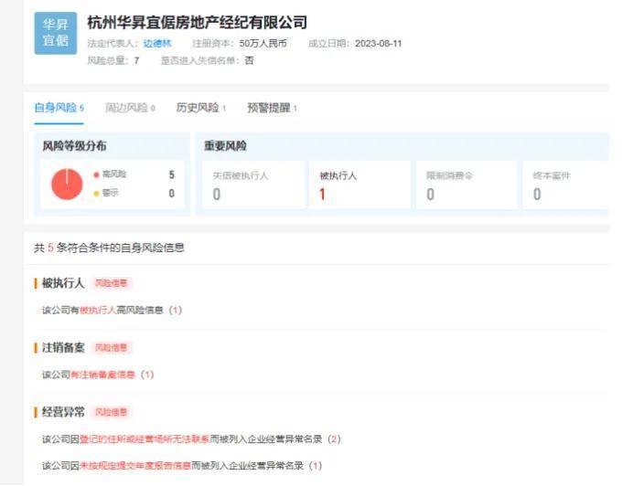 每经记者查阅天眼查发现,杭州华昇宜倨房地产经纪有限公司注册地为杭州市滨江区浦沿街道,2023年8月成立,人员规模为0,注册资金50万元人民币,实缴资本未显示。