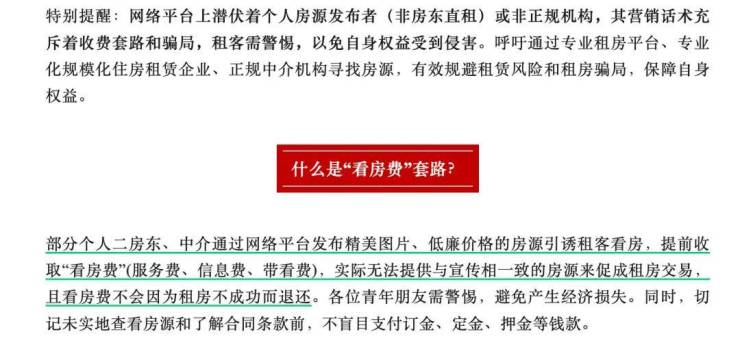 部分个人二房东、中介通过网络平台发布精美图片、低廉价格的房源引诱租客看房,提前收取“看房费”(服务费、信息费、带看费),实际无法提供与宣传相一致的房源来促成租房交易,且看房费不会因为租房不成功而退还。各位青年朋友需警惕,避免产生经济损失。同时,切记未实地查看房源和了解合同条款前,不盲目支付订金、定金、押金等钱款。