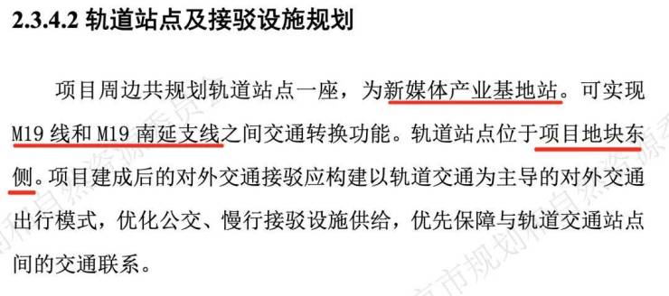 根据地块规划文件,19号线南延线的新媒体产业基地站位于项目东侧,并且地块应与轨道车站实现连通,应连尽连。