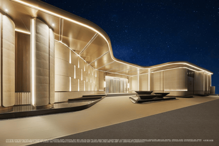 如今,近70米恢弘门庭已实景落成,成为城市中一道标志性的归家仪仗。定制铝型材经45°精准斜切嵌入,搭配精工铝板穹顶与多次调校的隐式灯组,每一处细节都彰显精工质感,每一次归途都被尊崇感包裹,让仪式感融入生活的每一个瞬间。
