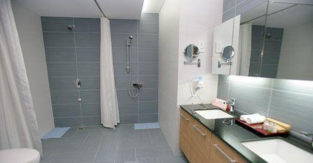公寓内卫生间整体为灰色调,显得颇为雅致,据现场工作人员介绍,为适应残奥会时,残疾人的特殊需求,公寓内两间卫生间中有一间是残疾人使用,淋浴处颇为宽敞,方便轮椅进出。而整个运动员公寓都设置了无障碍设施,方便残疾人活动。