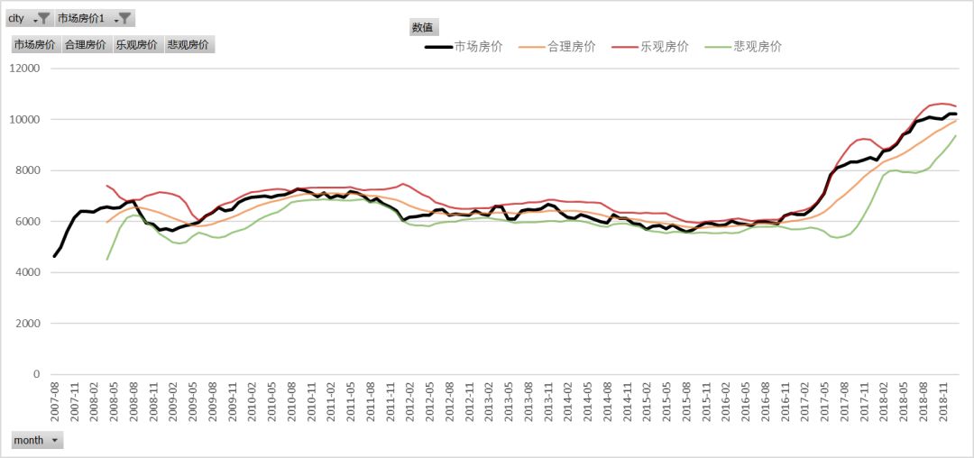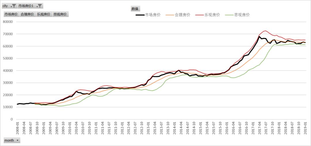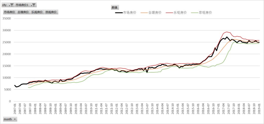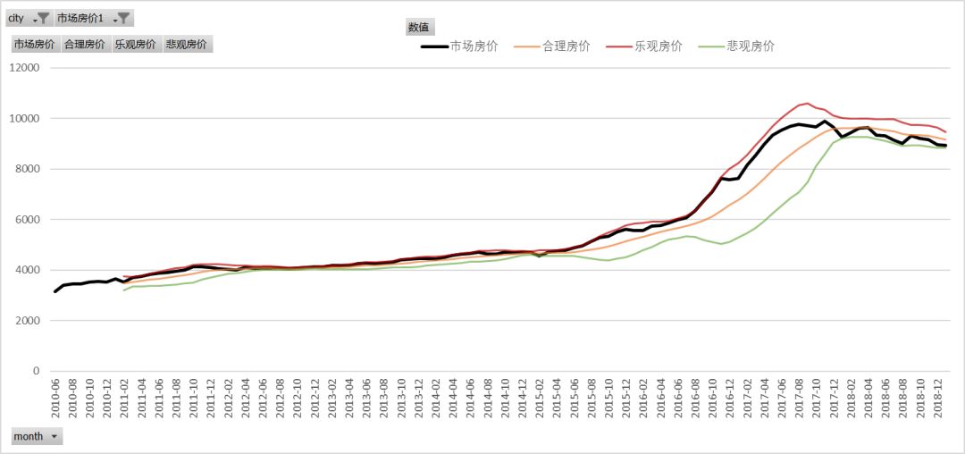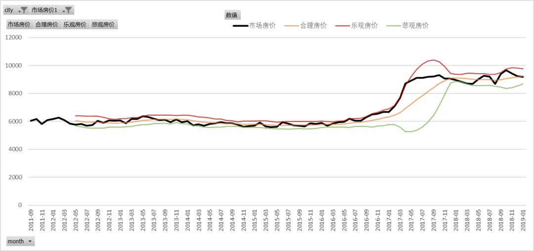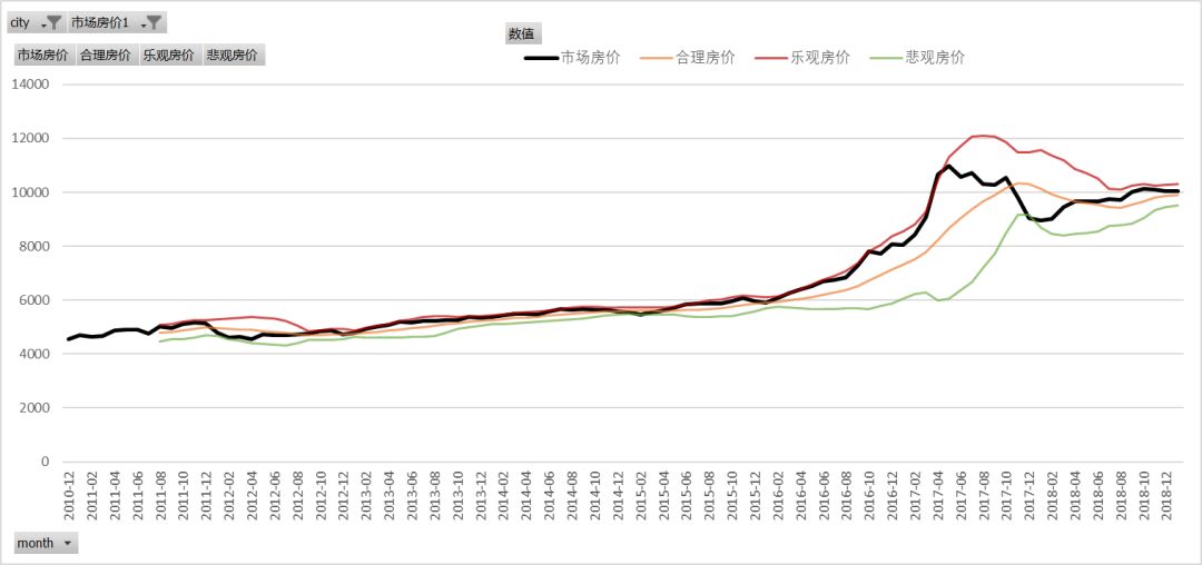 18年布林线走势与北京、天津相似,从房价周期滤波来看,19年上半年将处于回升阶段,意味着市场房价将在下半年逐步摆脱合理房价(10614元/m2),向乐观房价(10896元/m2)逼近。