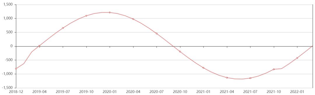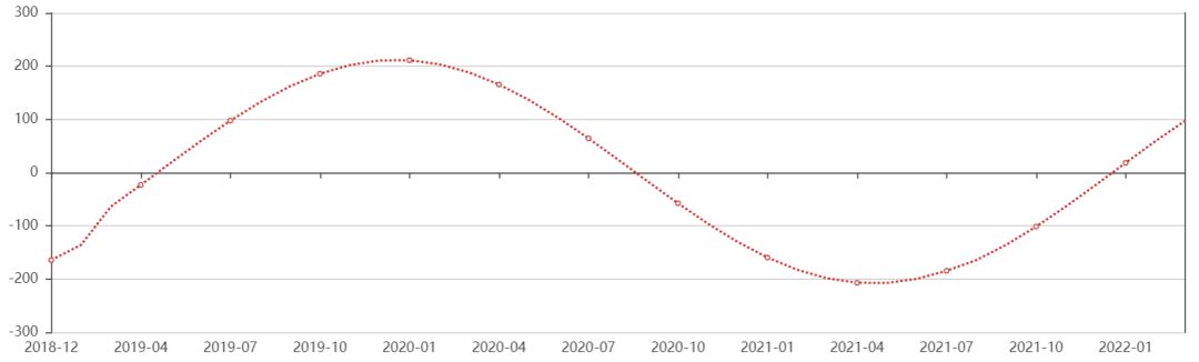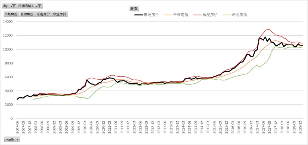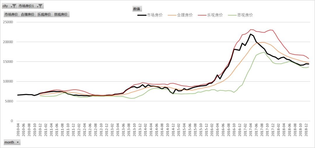 自17年4月开始房价周期进入高位回落向下调整,至18年10月份房价周期滤波触底,此时市场房价几乎跌破悲观房价(13622元/m2),自此近3月持续回归合理房价(14714元/m2),预期今年上半年房价将贴近合理房价上下运行。