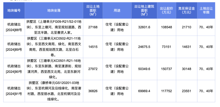 杭政储出[2024]91号地块,即拱墅区康桥单元GS120201-03地块,该地块东至杭钢河及沿线绿化,南至谢村路,西至丽水路,北至杭钢河及沿线绿化。地块出让面积36826平方米,出让地上建筑面积69969.4平方米,出让起始价117752万元,折合起始楼面价16829元/平方米。