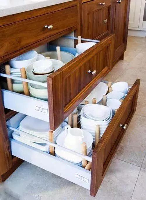 在橱柜内预留一个碗盘收纳的地方,以后碗盘都有了好归宿,找寻起来也方便不少。