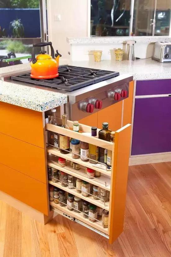 喜欢烹饪的人,家里应该都会有较多的调味料,这些小瓶瓶罐罐多了,操作台就很容易显得杂乱,这个时候就有必要在橱柜里留个拉篮了。