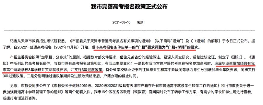 为啥慌?因为天津高考从之前只需要具备天津户籍,现在变成了需同时具备“户籍+学籍”。