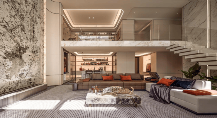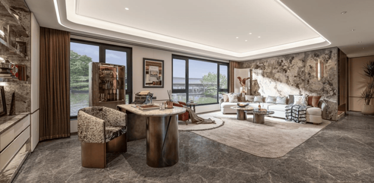如何契合当代居住美学,北京国贤府湖景府境给出了答案。在归家的仪式上融入传统礼制,地下光厅、地下精妆大堂营造归家仪式,国风岩板景墙、大堂顶级石材尼克石平铺,带来专属的尊崇感;首层媲美10万+豪宅精装标准,如首层125㎡及以上户型,主卧采用皮革定制背景墙,客厅采用岩板背景墙,地面以纯天然石材铺装,不仅品质感凸显,更提升了空间的审美格调,实现空间品质的再超越。