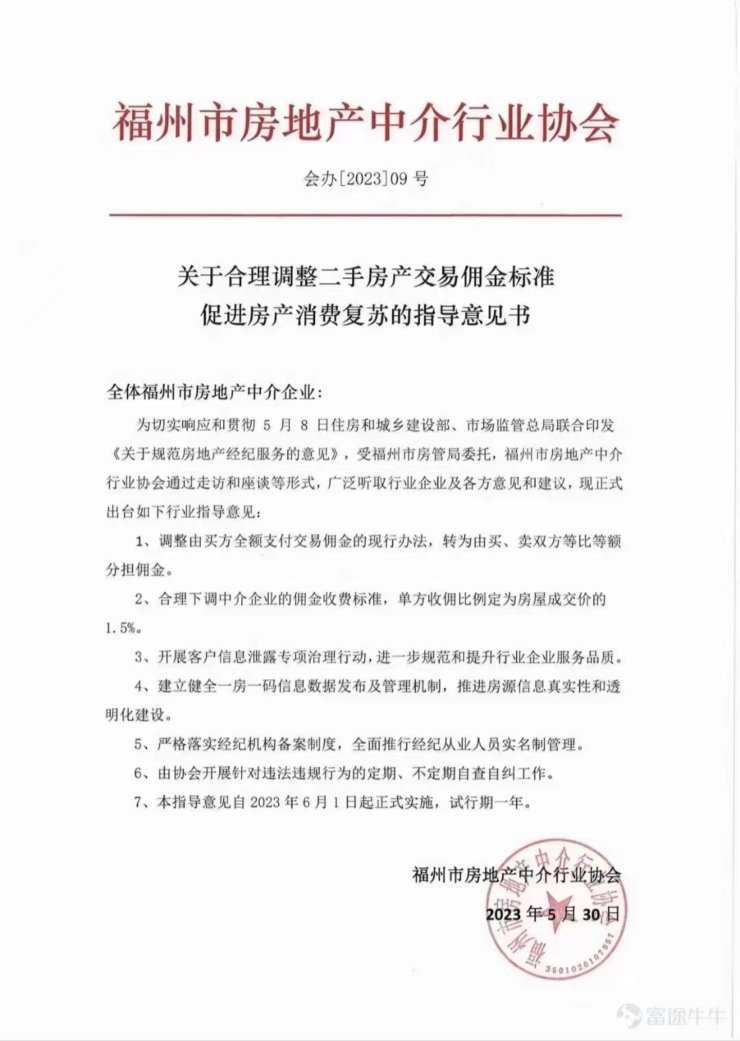 6月1日,福州市房地产中介行业协会发布的《关于合理调整二手房产交易佣金标准促进房产消费复苏的指导意见书》(以下简称意见书)已开始正式实施。