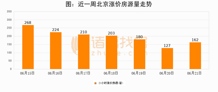 根据诸葛找房数据显示,北京24小时涨价房源量为162套,较06月20日增加35套,环比上涨27.6%。与此同时,涨价房源占比小幅扩大,业主信心有所提升。