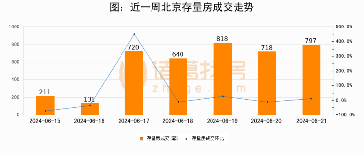从存量房来看,2024年06月21日北京存量房单日成交797套,比昨日增加79套,环比上涨11%。从近一周存量房成交来看,北京存量房日均成交套数为576套,06月21日单日成交797套,高于近一周平均水平38.4%。