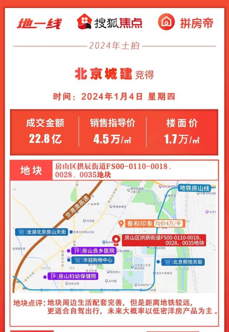 最后说下房山,房山拱辰0018等地块仅城建报价,最终以22.8亿元底价成交,住宅楼面价约1.7万/㎡,销售指导价4.5万元/㎡。其中0035地块容积率1.5、控高18(昊天塔高度管控范围外建筑高度24米),0028地块容积率1.6、控高24米,预计未来会建成低密洋房产品。这个地块在市郊铁路副中心线良乡站东侧,不临铁,对于依赖地铁出行的朋友来说不是很友好,周边新房有中建·京西印玥、中建学府印悦,均价在4万左右。
