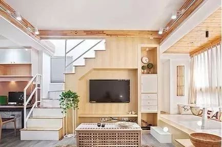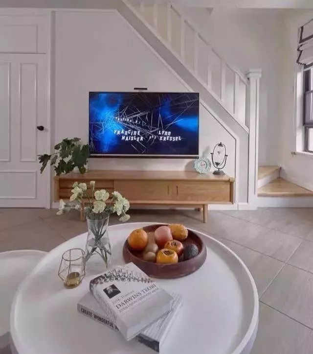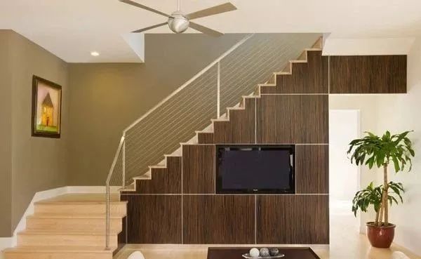 如果楼梯刚好在客厅,可以把楼梯下方墙面设计成电视背景墙,在增加储物空间的同时,也将空间利用的非常到位,以不同的形式来打造不同的视觉感受。