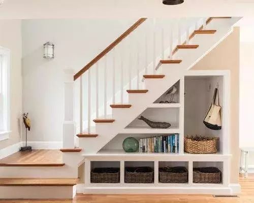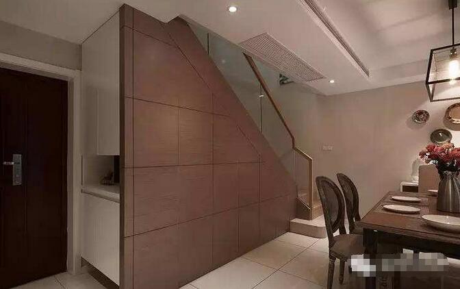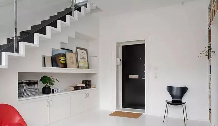 如果楼梯在一进门口处,那可以将楼梯和玄关合二为一,将楼梯的的底部充当玄关柜功能,这样的设计既美观又实用,既把家里的空间合理利用起来,又省下了另外购置柜子的费用和柜子所占的空间。