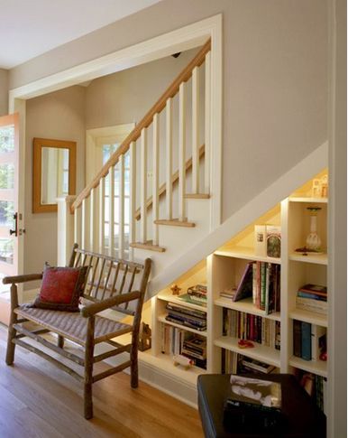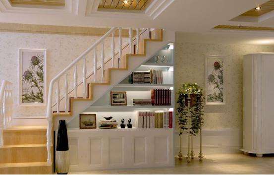 对于喜欢看书有藏书习惯的人来说,想要一个单独的空间存放书籍是一件很奢侈的事。这时候楼梯下方的空间就能发挥作用了,利用楼梯的阶梯优势打造一个书柜来摆放书籍,给空间省了装书的地方。