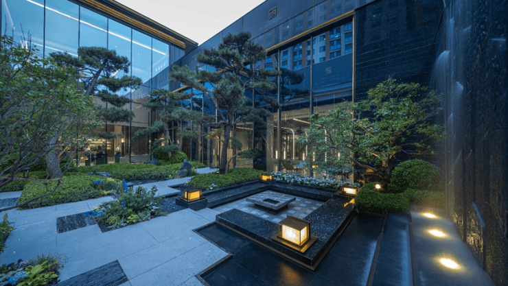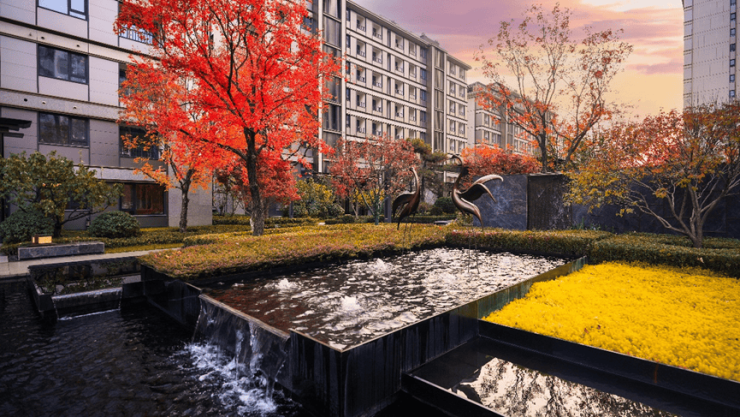 在繁华深处营造一方宁静,是高端生活的另一重维度。臻园以乾隆花园格局为灵感,打造“一环两轴六境九园”的立体园林体系。园区内融入《溪山行旅图》意境,结合名贵乔木、叠水景观及六大功能场景,并巧妙构筑丰科板块罕有的下沉式庭院会所,让居者随时切换于都市繁华与自然静谧之间。