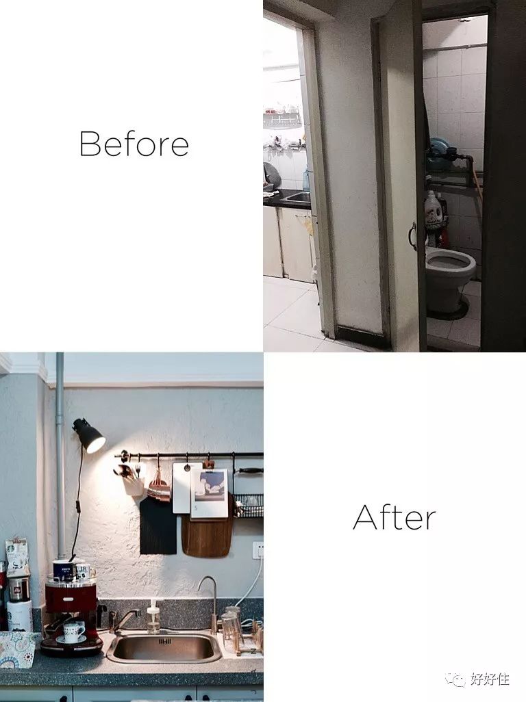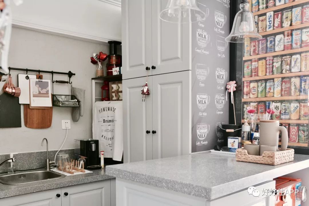 因为是90年代的公产房,屋主@哎呦杨小珣 家有许多无法拆除的裸露管道,非常破坏家里的视觉效果。为了解决这个问题,杨小珣在设计橱柜时在管道处做了一个顶天立地的通柜,除了挡住水管,还能放置餐具和杂物,不仅美化了厨房,还解决了小户型厨房的收纳问题。