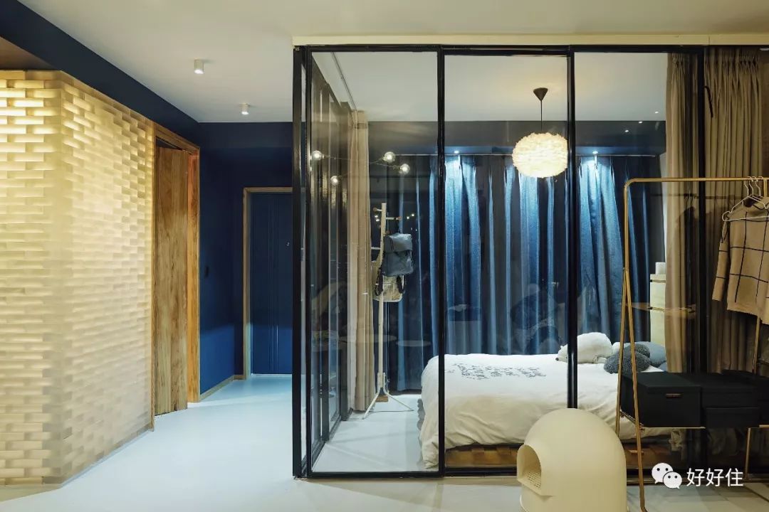 屋主找到设计师@matt琛-路塔路塔工作室 来帮她设计新家,希望解决这些问题。设计师没有用传统的砖墙来划分各个空间,而是用「玻璃」做墙。玻璃砖分隔出卫生间,玻璃推拉门分隔出卧室。并且用蓝色墙漆区分活动空间。