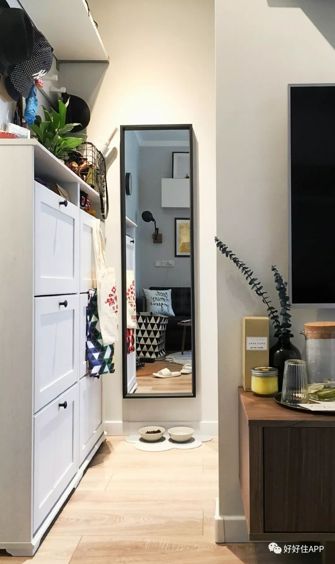 住友 @SnowFong 是美致设计里的改造玄关大神,她家入门后的小窄道上,前有宜家推车,后有宜家大鞋柜——推车下层放常穿的外出鞋和拖鞋,上层有有钥匙剪刀等日常用品;宜家大鞋柜顶上有放挎包的铁艺收纳筐和挂帽子的挂钩,还有花瓶、照片、香氛等装饰。