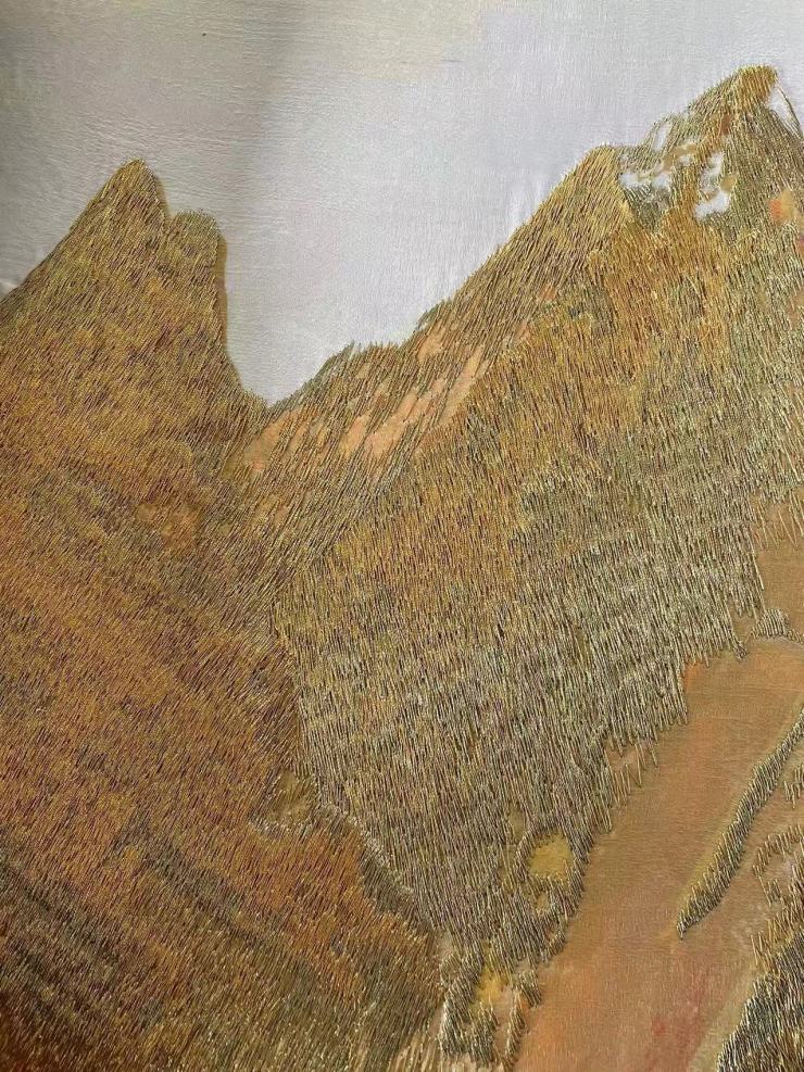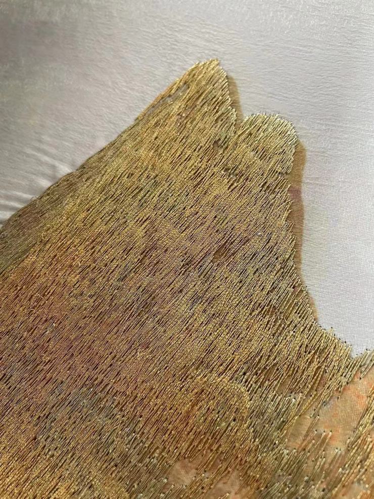黄河(龙脉)的水纹弯曲、流动,要表现出自然的流动感,需要精湛的刺绣工艺加持。刺绣过程中,使用大量的融合双面锯齿铺针填充,针法大胆厚重;铺针上采用手动针晕色过滤实现细节的精细化表现,在全局的大气感和细节的精致度上达到协调统一;明暗对比强烈的用色以及彩金线加强 提亮的表现能较好的表现出黄河的奔腾汹涌、生生不息。