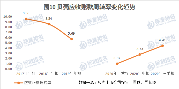 图10是贝壳2017年-2019年及2020年三个季度应收账款周转率变化情况,可以看出2017-2019年应收账款周转率分别为9.56次、8.54次、5.69次,呈现下降态势。而2020年前三个季度应收周转率分别为0.97次、2.73次、4.41次,呈现上升态势。