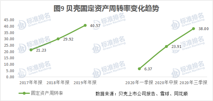 图9是贝壳2017年-2019年及2020年三个季度固定资产周转率变化趋势,可以看到固定资产周转率均呈现上升的态势,这是因为平台经济的发展模式,补充完善了自营模式的发展,减少了线下门店的盲目扩张,随着线上交易值的攀升,在固定资产投入趋于稳定的情况下,使得固定资产周转率呈现上升态势。