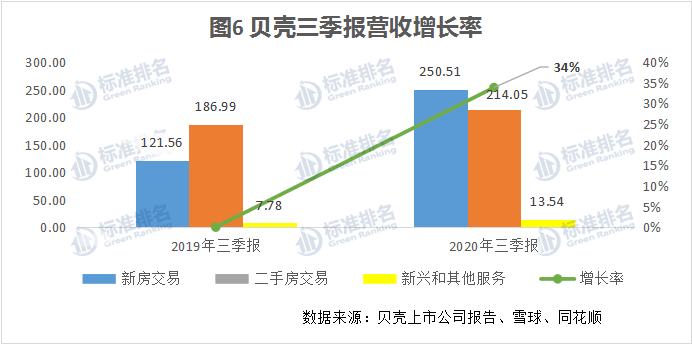 图5、图6是贝壳营业收入类型结构近三年以及2020年三季度同比数据的变化。可以看到,2019年新房交易的收入贡献同期对比前两年、2020年三季度同期对比去年呈现较大增幅,甚至一跃超过二手房交易收入。资金快速回笼,也从侧面看出其销售拓展能力,得到了市场的充分验证。