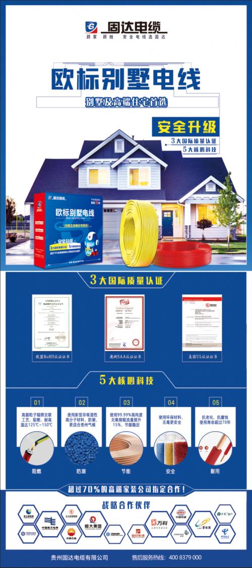 近期,固达电缆有限公司新研发的高端新品欧标别墅电线宣布正式上线。该产品在专业防潮效果上有出色表现。据悉,其产品采用的是固达电缆公司与贵州大学博士专家组共同研发的非吸湿性高分子材料,在潮湿环境下工作不会因为电线受潮而形成“水树枝”,从而能够避免“水树枝”带来的电线短路引发火灾,极大降低介质损耗,从而,该款产品即使在潮湿的使用环境下使用寿命也可超过70年。