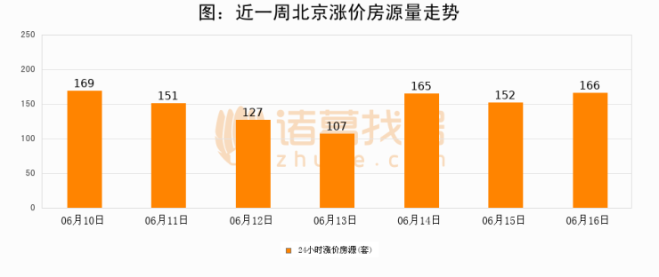根据诸葛找房数据显示,北京24小时涨价房源量为166套,较06月15日增加14套,环比上涨9.2%。与此同时,涨价房源占比小幅扩大,业主信心有所提升。