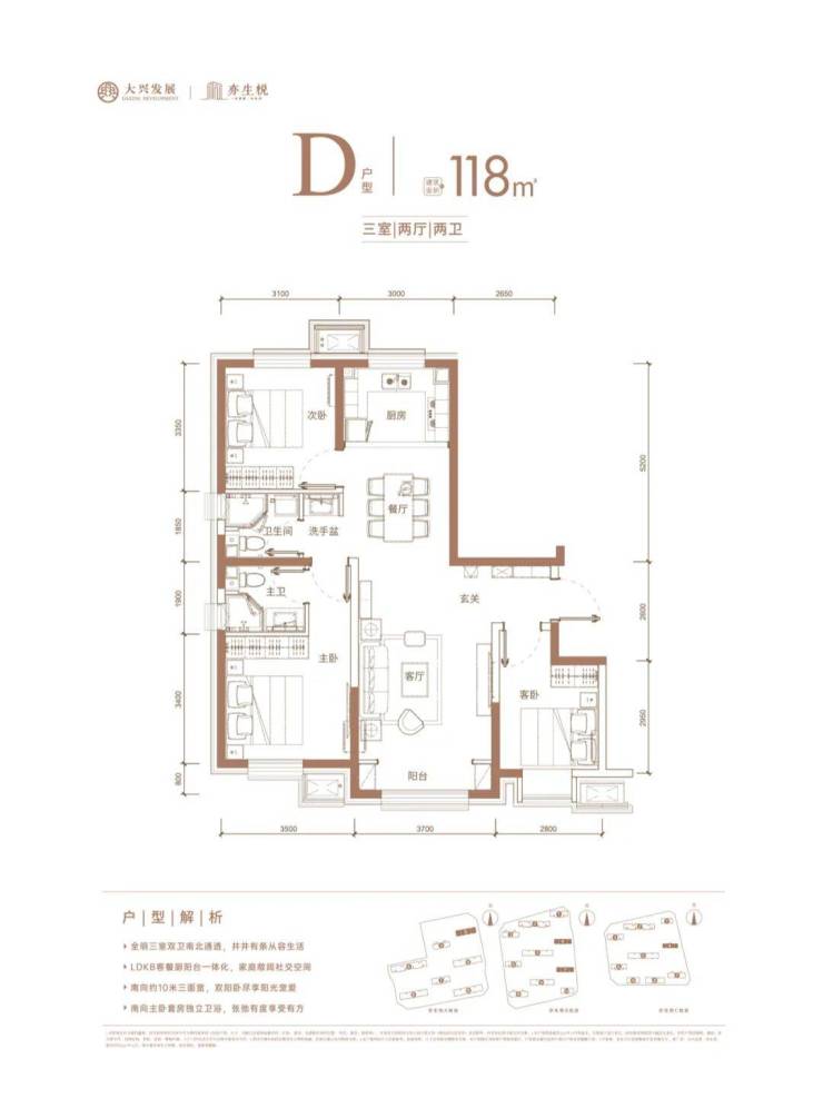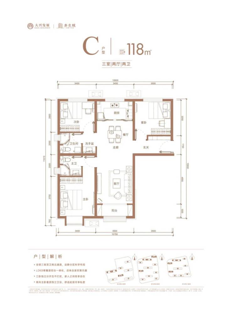 两种户型在主卧均配备独立卫生间,南向客厅外设有阳台,同时,南向卧室也设计了飘窗,有机拓展居室面积的同时,也为生活注入更多乐趣。建面约118㎡三室两厅两卫将采光通透性拉到满分,C户型和D户型均为270°采光的全明户型,餐客厨空间开阔,U型厨房足可容纳一家人同时操作,餐厅也预留出餐边柜的空间位置。主卧配备全明独立卫生间的同时,北向客卧邻近干湿分离的全明客卫,形成“双套房”的居住体验。