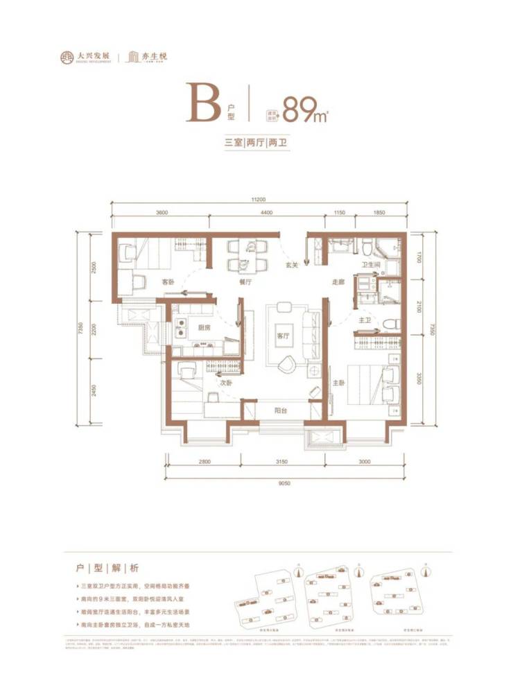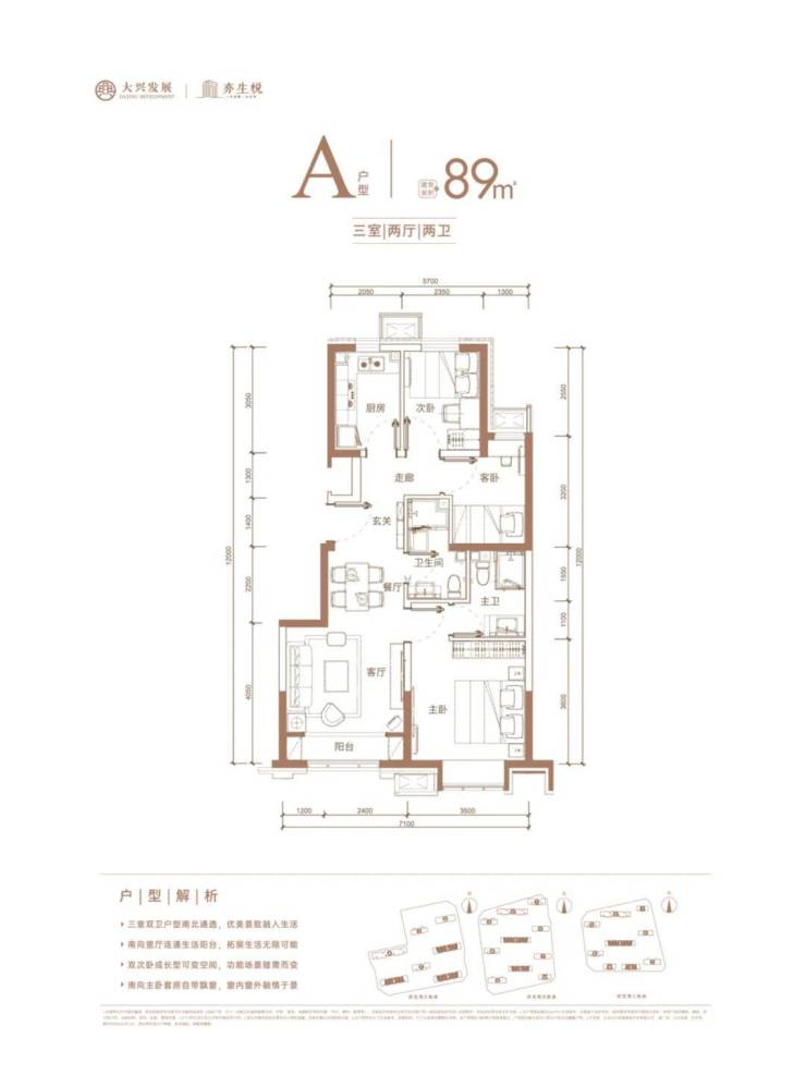 在建面约89㎡空间内,大兴发展亦生悦罕有地规划出三室两厅两卫的功能格局,分别设计了南北通透的A户型和全南四面宽的B户型,供买房人按需择选。