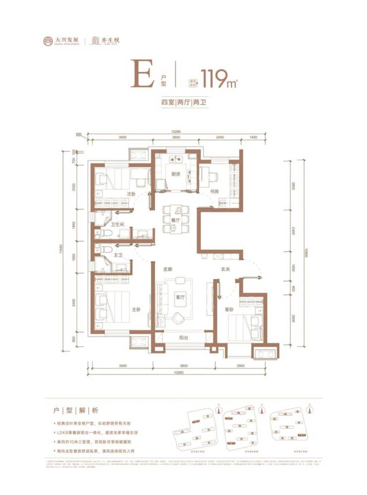 最大户型是建面约119㎡四室两厅两卫,采用经典的“四叶草”设计,客厅、餐厅、厨房放置在同一轴线,实现一体化设计,为家庭情感交流提供多重场景,四间卧室分处四角,为每位家庭成员预留独立空间,工作、学习、休闲、娱乐互不干扰。南向阳台和飘窗让空间更显开阔,整个居室每一处空间都得到有效利用,让生活更从容。项目为全装修交付,配置大品牌高标准的装修用材,配备全屋地暖,双卫双淋浴,从样板间效果图看,整体简约大气,呈现绝佳的适配度,无论购置中西风格的家具家电,都能轻松搭配入住。