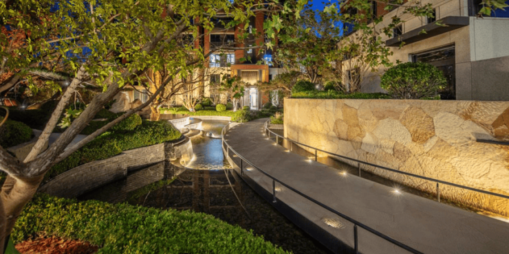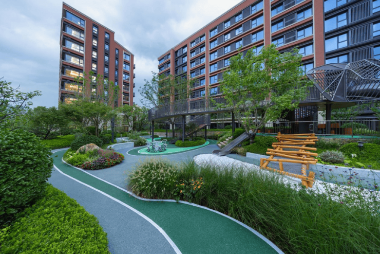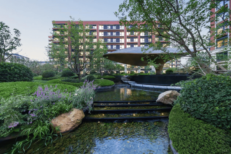 穿过“京华长廊”的金属格栅,驻足于“山水清音”水榭前:叠水从黑色石材上倾泻,锦鲤在深灰砾石池底游弋,岸边丛生紫薇与鸡爪槭相映,正是“一卷代山,一勺代水”的造园哲思。“满庭芳”花境里,白玉兰与丁香散发着淡淡香气;而“树语童心”乐园里,美国红枫与山桃树环绕着“森林厨房”,藏进孩子的玩乐日常。