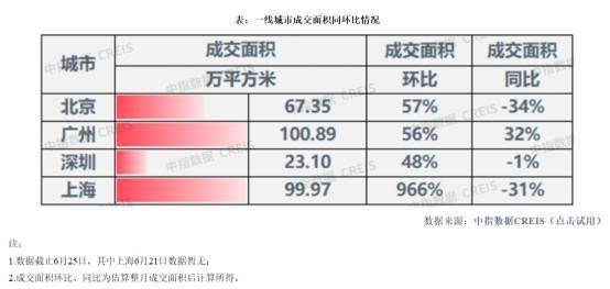 六月一线城市成交量整体环比上升,为122.1%,分城市来看,上海涨幅较大,为966%;北京次之,为57%,广州升幅56%,位列第三。同比来看,整体成交下行,降幅为16.1%,其中广州上升,增幅为32%;北京降幅较大,为34%。