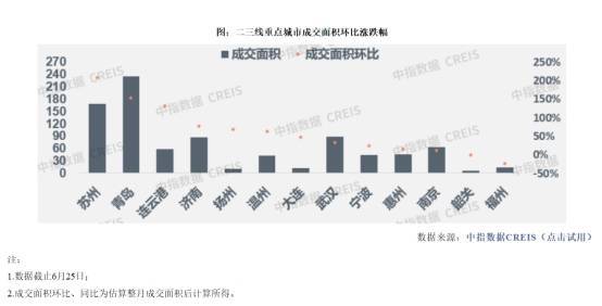 二线代表城市环比上涨84.4%,同比下降17.5%。环比上涨的城市中,苏州涨幅显著,为208.5%,青岛涨幅153.5%,位列第二,济南涨幅77.5%,排名第三;福州出现环比下降,降幅22.9%。三线代表城市成交量环比上涨56.1%,连云港涨幅较大,为131.7%,扬州涨幅居次位,涨幅68.3%;韶关出现环比下降,降幅1.3% 。同比来看,整体下降7.8%。