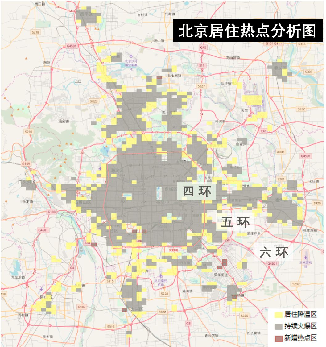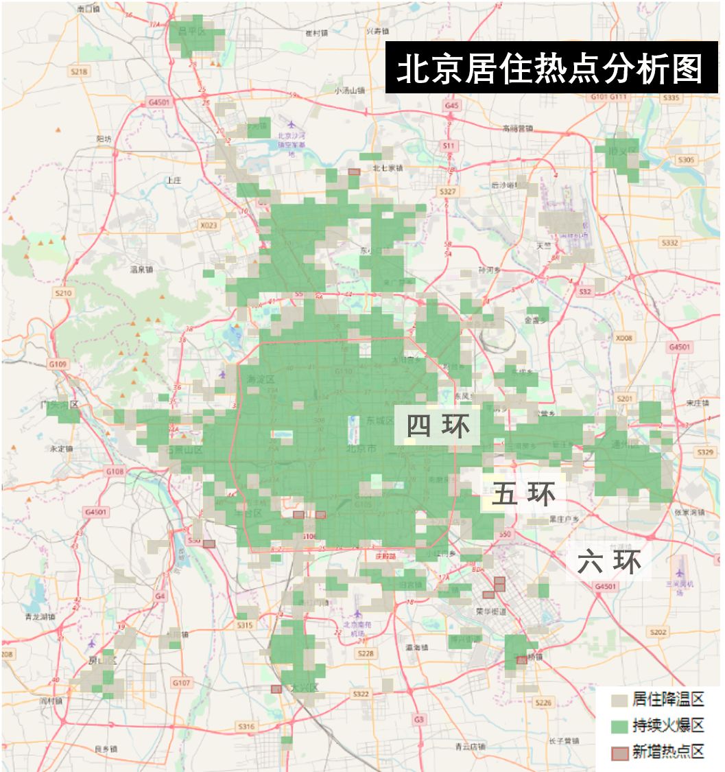 但从另一方面来看,有397个网格,居住热度有所下降,且仅新增9个居住热点网格,彰显了北京严格控制人口的决心。