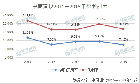如图所示,2015—2019年中南建设的毛利率分别为21.58%、16.41%、16.31%、19.56%、16.75%。中南建设称对于毛利率下滑是由于公司过去在房地产业务领域的战略选择不清晰,在远离核心发展区域的小城市郊区获取了一些规模较大的项目,这些城市市场容量有限,这些项目销售周期长,导致资金时间成本高,项目利润率低。