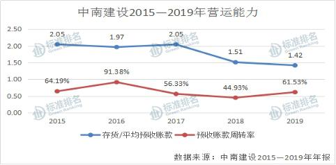 如图所示,中南建设2019年的“存货/平均预收账款”为1.42,近几年总体呈下降趋势,也表明了中南建设存货去化压力有所增加。