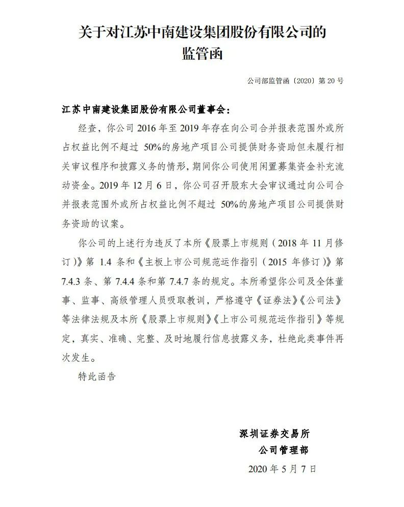 5月7日,深交所发布了关于对江苏中南建设集团股份有限公司的监管函,内容直指公司信批违法、违规。