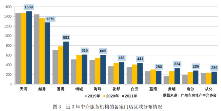 2021年,广州全市共计备案中介门店 6952 家,较 2020 年增加 253 家。其中天河区是全市备案门店最多区域,共有 1509 家;越秀区连续三年下降,以 1279 家位居第二位;同比出现下降的还有荔湾区;其余各区备案门店都有不同程度的增加,其中番禺区、黄埔区、海珠区增长较明显,同比分别增加 99 家、64 家、57 家。