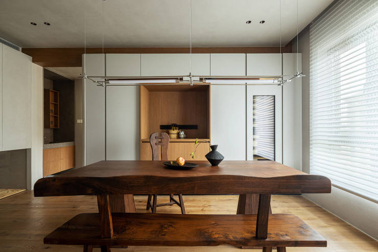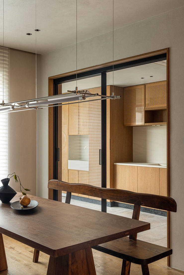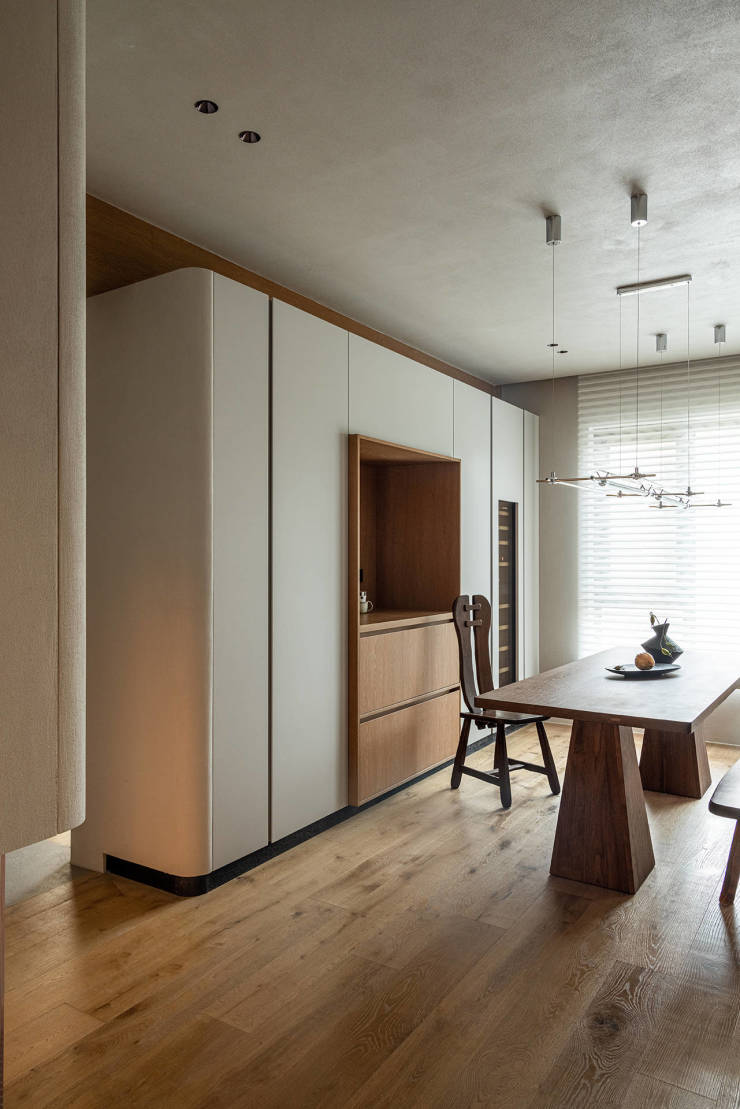 利用餐厅一面墙的位置,嵌入“木盒子”式的餐边柜作为西厨操作台,与茶室相呼应。柜子上方生出几根“木梁”与客厅形成区域间的关联性,展现着开放与自由,独特而不哗众的姿态,呈现出空间的与众不同。