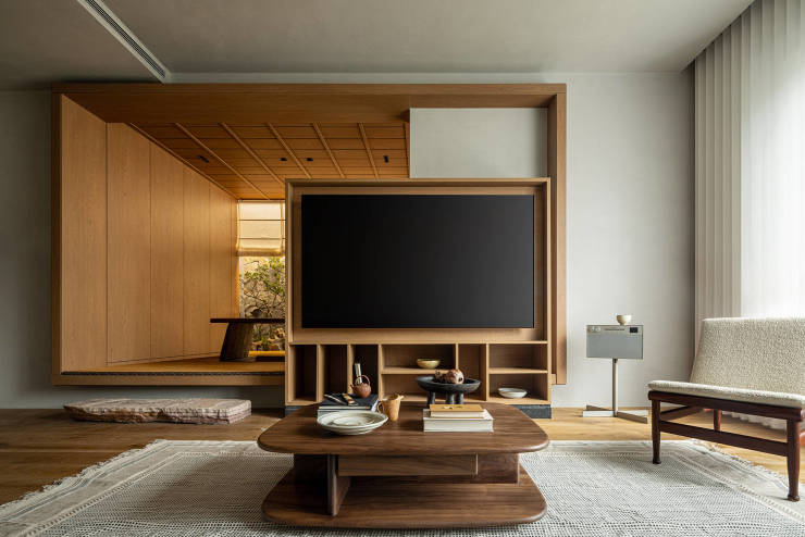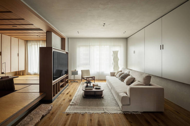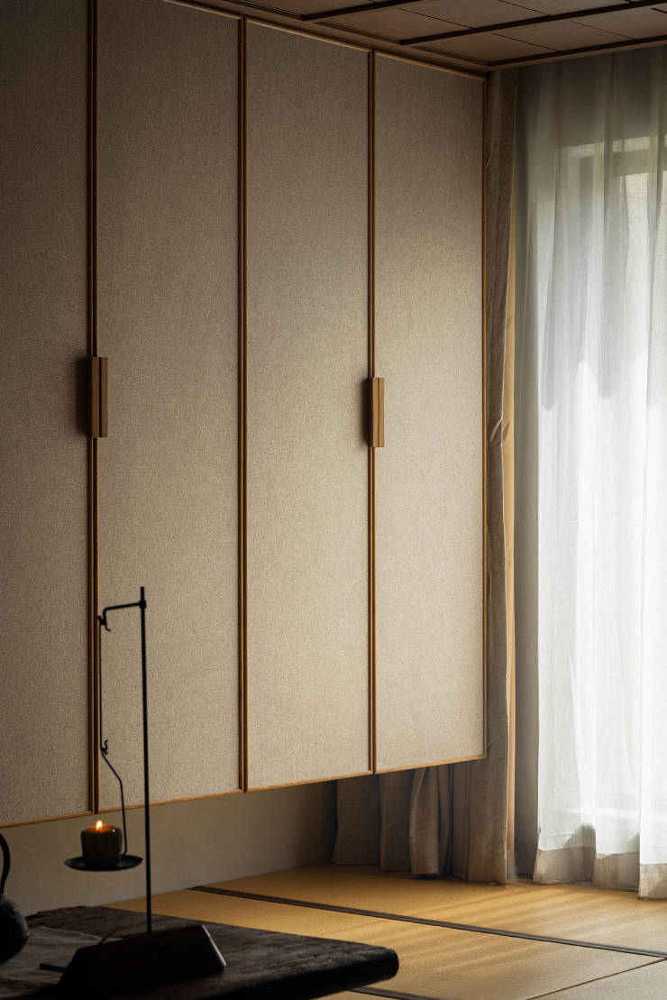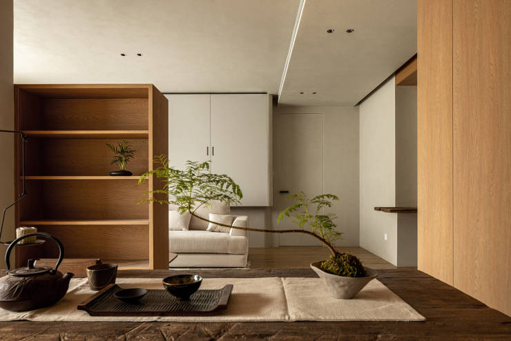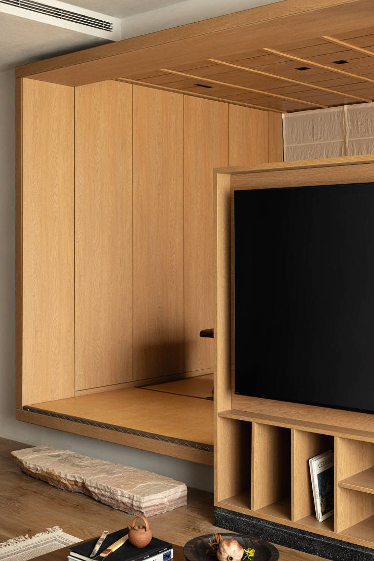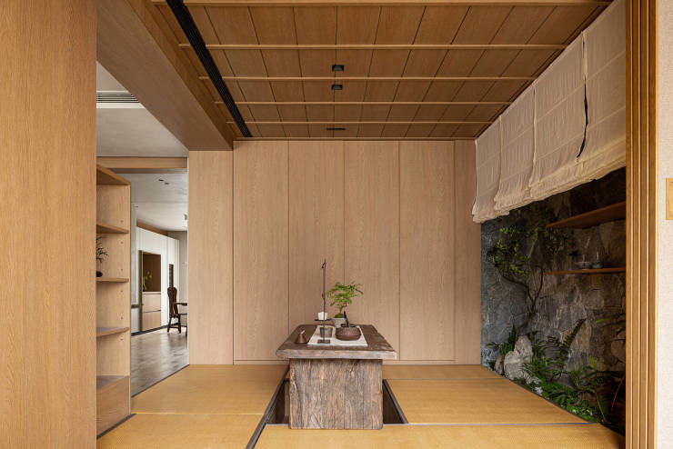 身处室内茶室,茶器有序陈列,茶香吹拂,绿植环绕,仿佛置身于自然惬意的庭院。茶室深处的榻榻米则叠加了卧室功能,是母亲或其它客人短期造访也能踏实入睡的空间。