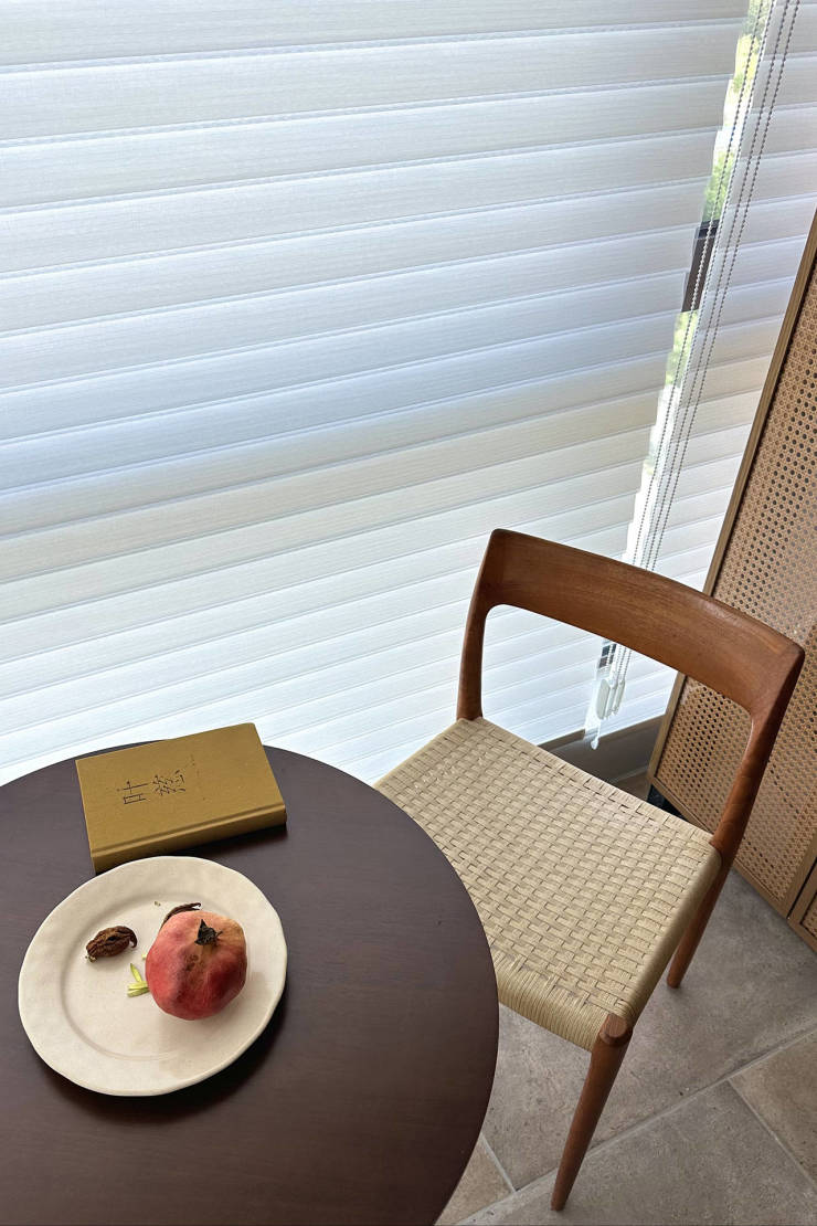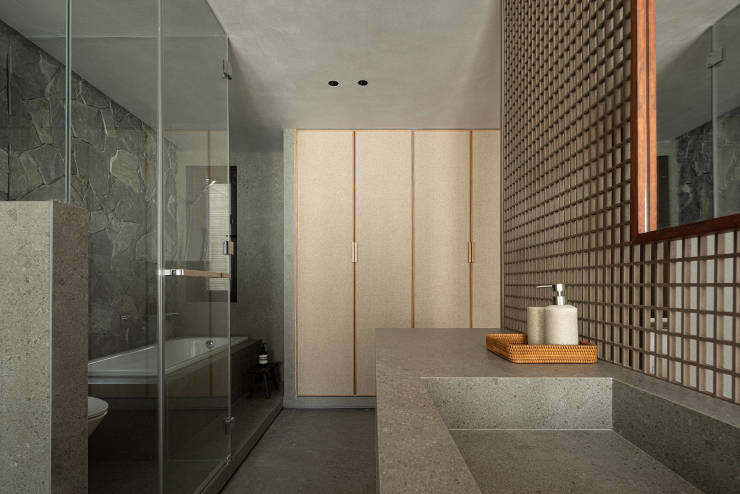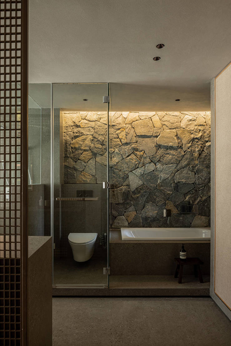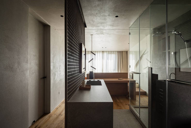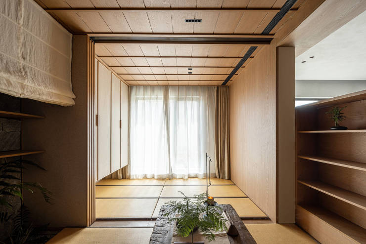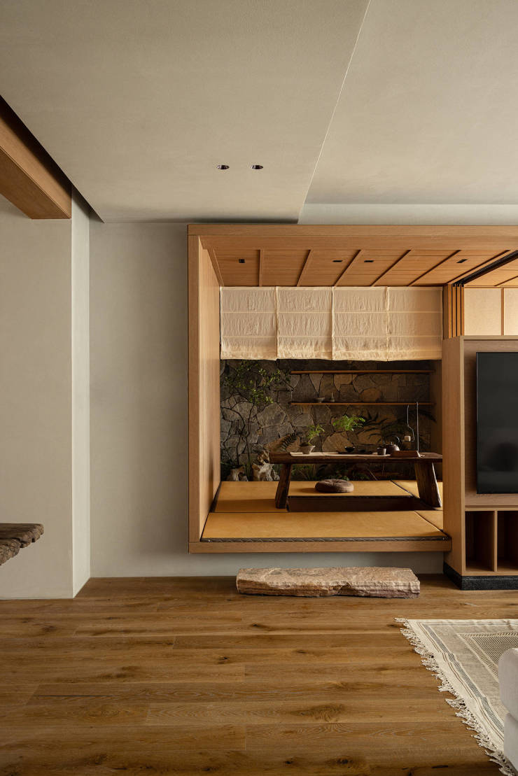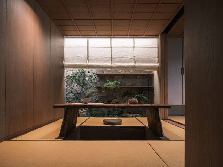 “室内庭院”成为茶室中特别的存在,天光洒在绿植和岩石墙上,隐藏式的风扇装置,引入微风,朦胧的布帘上放映着摇曳的树影。