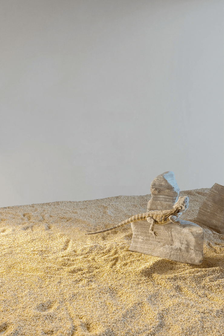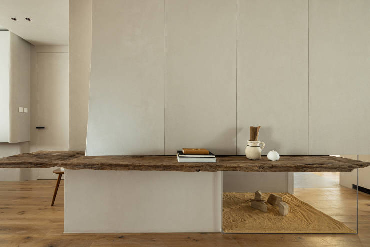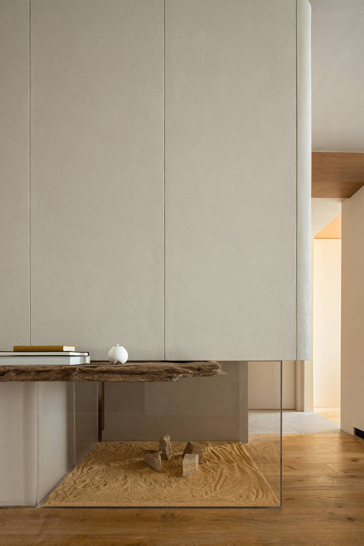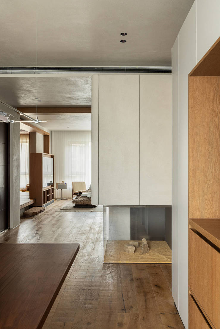 老木带着时间沉淀的斑驳形态,横插入立面,体块错落有致,带来丰富的视觉层次。立柜下方嵌入微型景观,位居视觉交汇点,从玄关、餐厅、主卧都能观赏,鬃狮蜥穿梭在黄沙和岩块之间,成为家中独特的动态的景观。