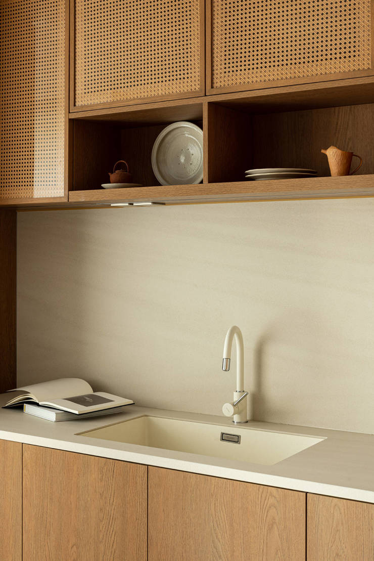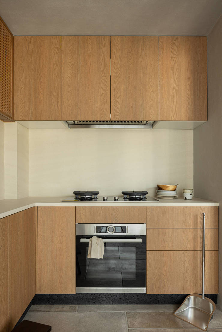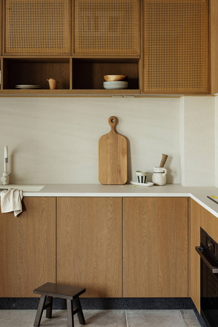 中厨地柜与吊柜的经典组合带来强大收纳功能。整体色彩延续木色与简洁的象牙白,同时插座面板隐于吊柜底部,让视觉更加简洁。
