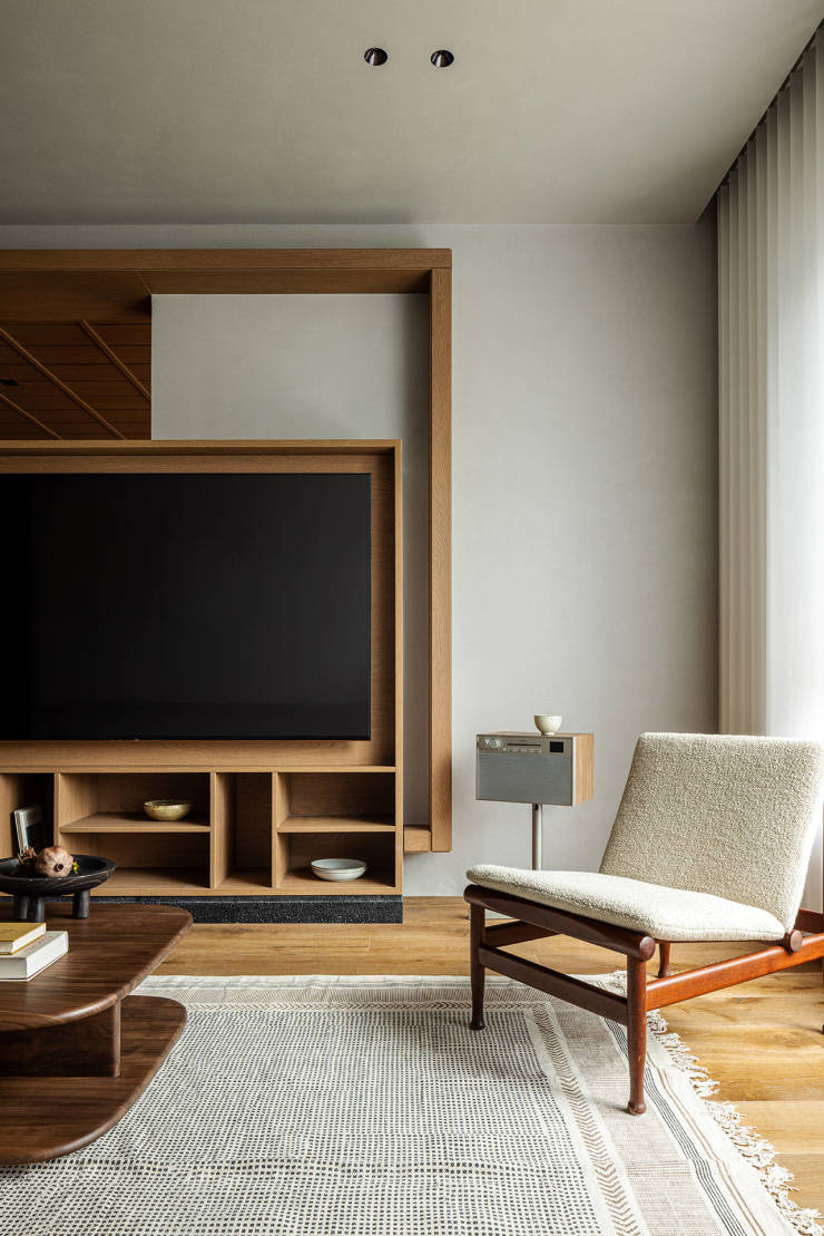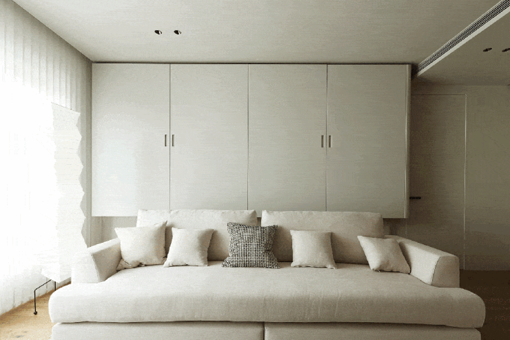 整面上墙书架成为书香客厅的背景,移门设计赋予书墙便于打理的优点,也让一片书墙有了两种风格,关上门,是极致简约的“白墙”;打开门,是一整面书墙。电视背景墙突破传统做法,融入建筑中的“盒子”概念,将电视嵌入框架中,并在下方加入收纳功能。