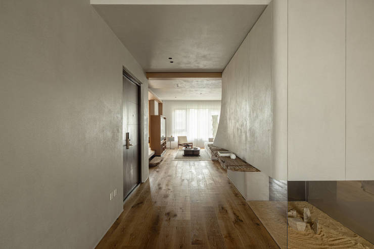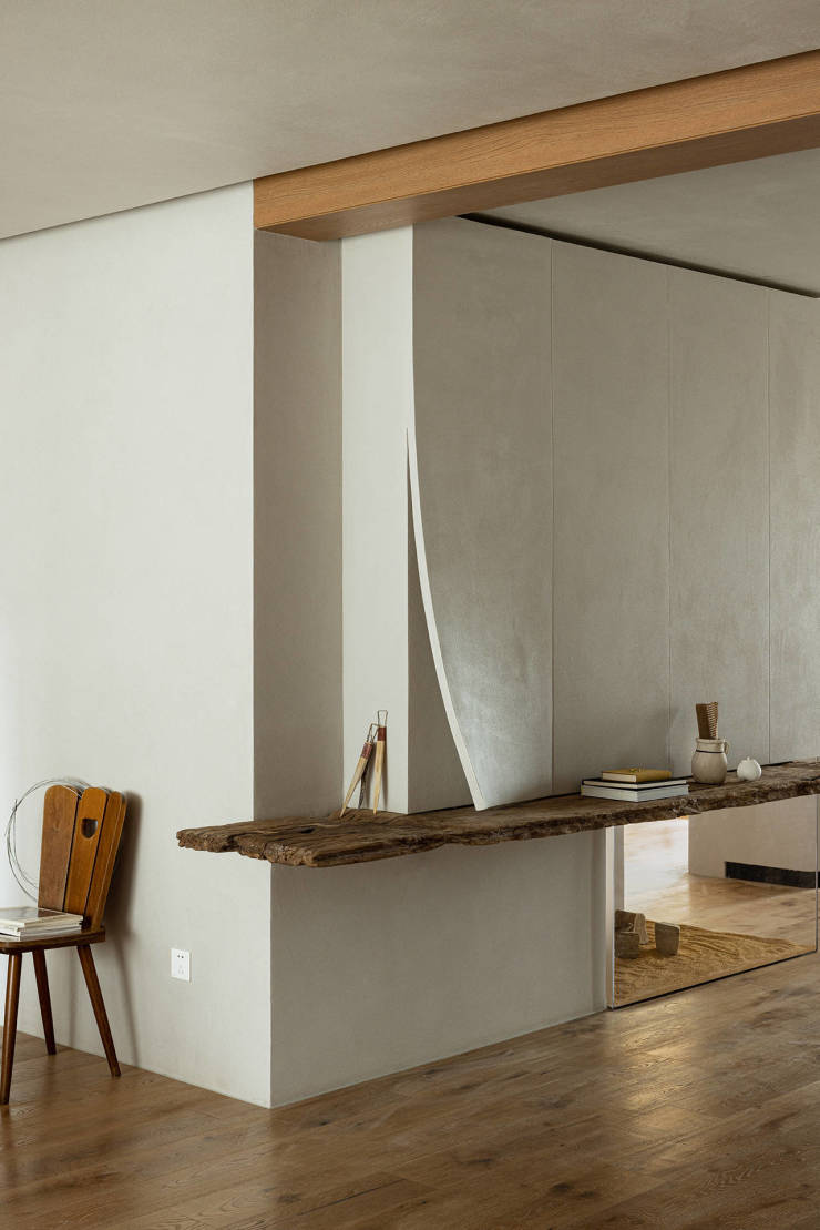 玄关由老木、隐形柜体、微型景观三部分构成,与墙面一体的柜体设计,弱化柜体的存在感,同时具备强大收纳功能。